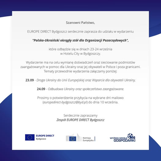 EUROPE DIRECT Бидгощ (Польща) сердечно запрошує до участі у заході "Польсько-український круглий стіл для неурядових організацій", який відбудеться 23-24 вересня в City Hotel у Бидгощі, а також у гібридному форматі (лінк для онлайн-участі та агенда буде надіслана зареєстрованим учасникам).